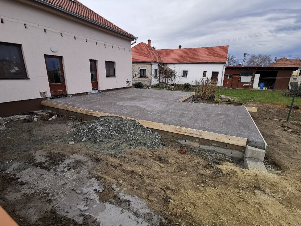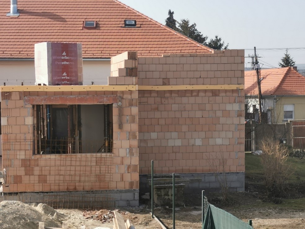 A munkaterület előkészítését követően a bővítmény alapozása megtörtént. A homlokzati falak és az épület lapostetős födémszerkezete és az épület homlokzatának szigetelése elkészült, a belső munkálatok is folyamatosak. A kerti épület és a fedett terasz faszerkezete szintén szerkezetkész, a kertépítési munkák és a napelemes rendszer bővítési munkái is elkezdődtek.