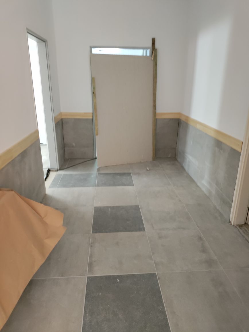A belső burkolási és festési munkák mellett a vizes helyiségek szerelvényezési munkálatai is folyamatosan haladtak. A szaniterek elhelyezésre kerültek, a gépészeti munkák és villamos szerelvényezések is készülnek, valamint a világítótestek is felszerelésre kerültek. A folyosó falburkolata elkészült.