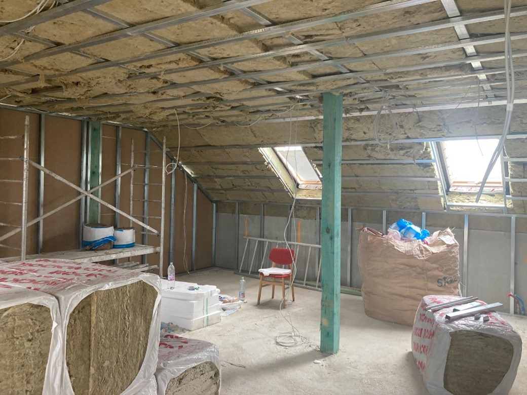 A fejlesztés egyik lépcsője az épület és a tetőtér szerkezeti bővítési munkáinak kivitelezése, majd a projekt keretében az épület homlokzatainak, pincefödémének hőszigetelése valósul meg.