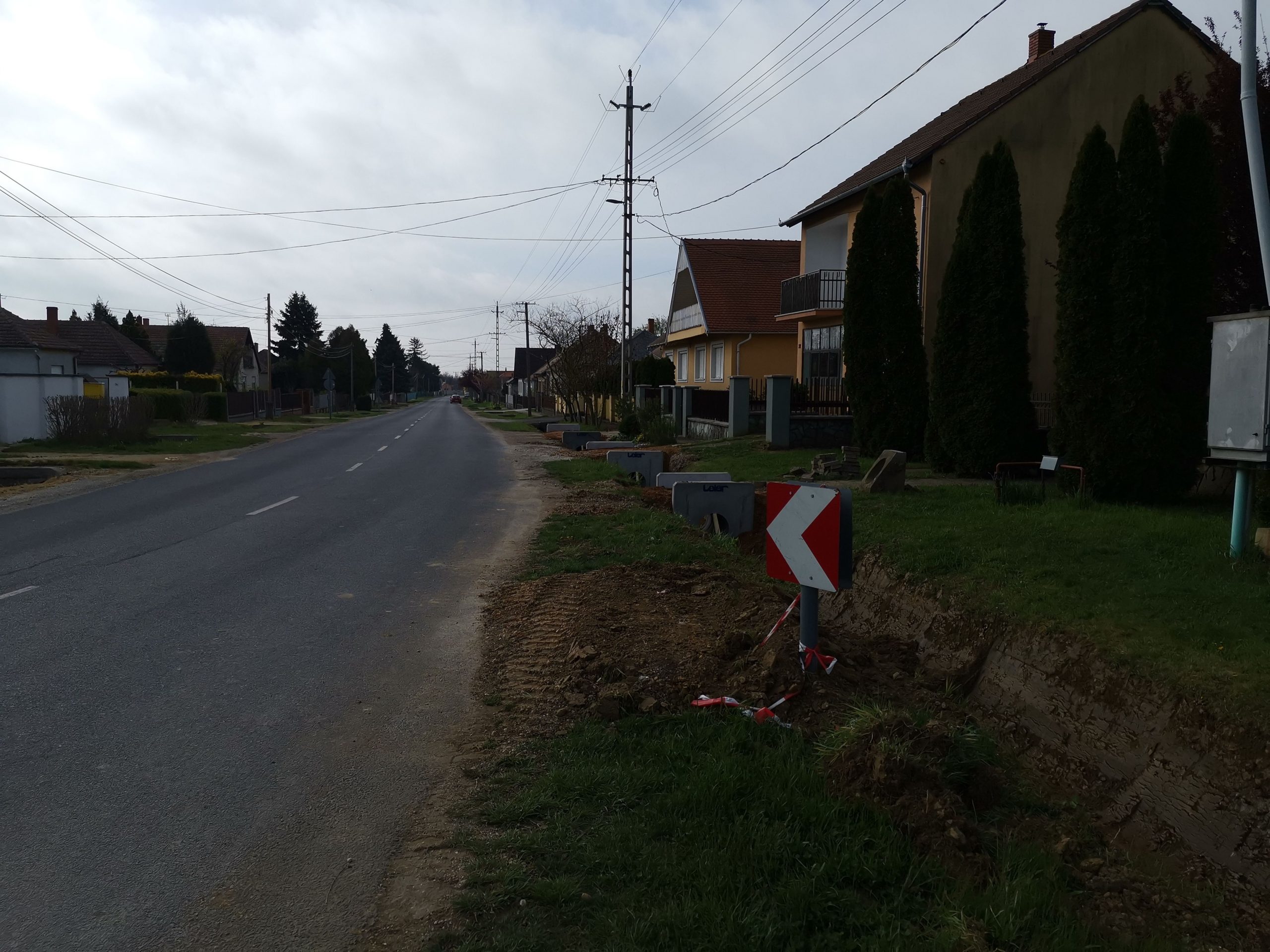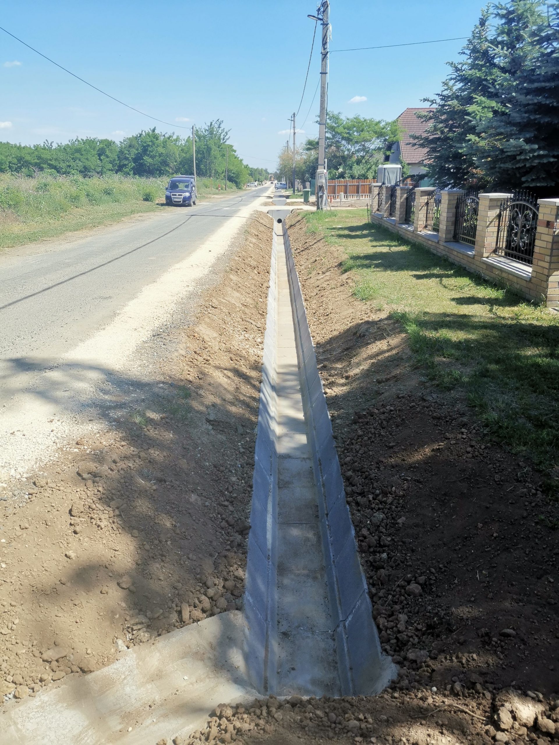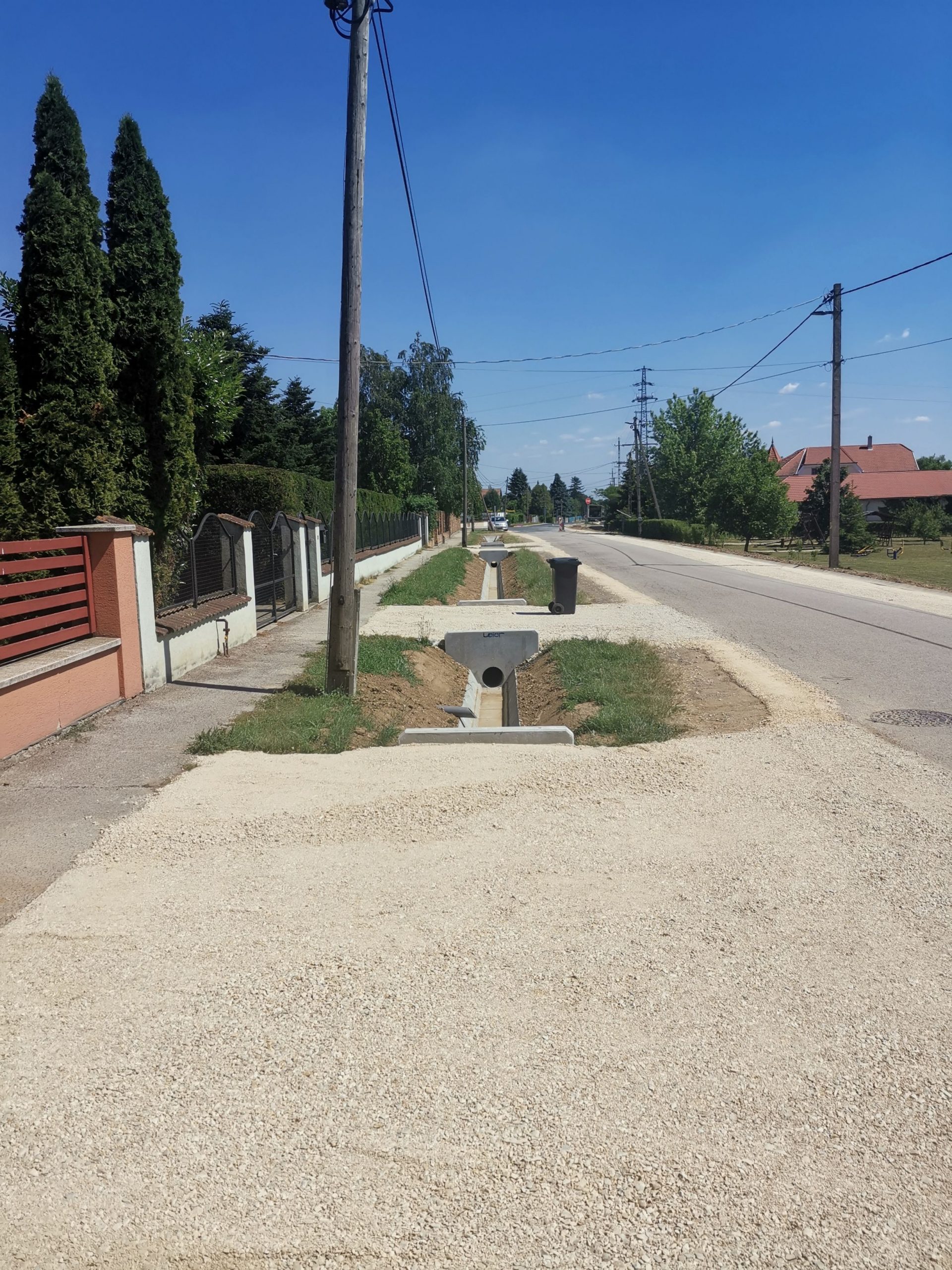 A kivitelezés 2021. május 18-án elérte az 50%-os készültséget. A munkálatok a meglévő közművek kutatóárkos feltárásával és így azok elhelyezkedésének pontosításával kezdődtek. A közműfeltárások előrehaladásával megkezdődtek a munkaárkok gépi földmunkái, melyet követően folyamatában kiépültek a kapubejárók alatti Ø30 betoncsöves csőátereszek az azokat lezáró előregyártott homlokfalak beépítésével. A kapubejárók közötti burkolt árok szakaszokon elkészültek az árokelemek alatti ágyazó rétegek és az alsó szakaszokon megindult az árokelemek beépítése.