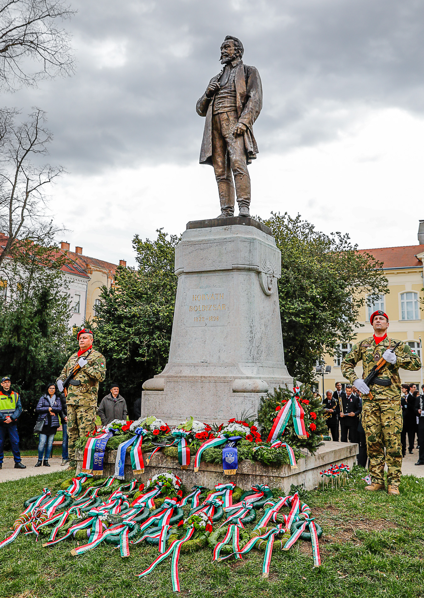 Rövid megemlékezés után továbbindult a tömeg a Március 15. térre, ahol a Magyar Honvédség 12. Arrabona Légvédelmi Rakétaezred díszalegységének tisztelgése közepette, a Himnusz hangjai mellett felvonták a nemzeti lobogót. Az ünneplők Szombathely Város Fúvószenekarának katonás felvezetésével vonultak át a Savaria Múzeum parkjába. A belvárosban még többen csatlakoztak a menethez.