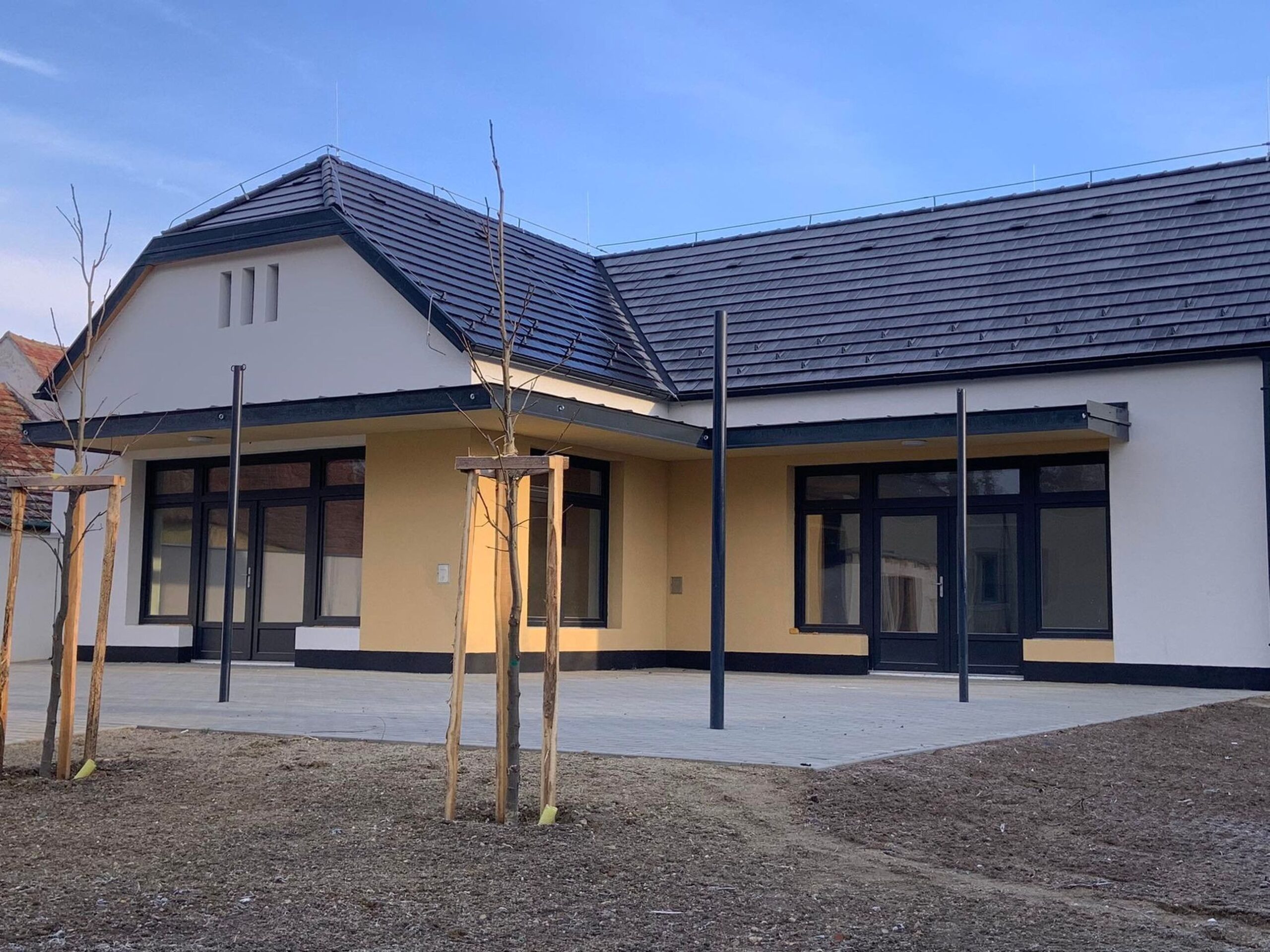 A telken új térburkolatok kerülnek kialakításra, kertépítés és játszóudvar építése valósul meg. A bejárat megközelítésére új kültéri lépcső és akadálymentes rámpa épül. A bejárat szomszédságában kerül kiépítésre egy babakocsi tároló.