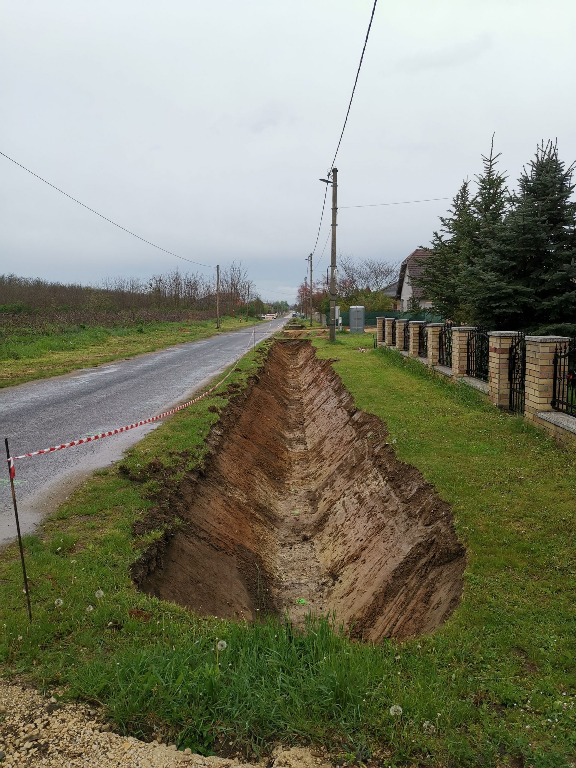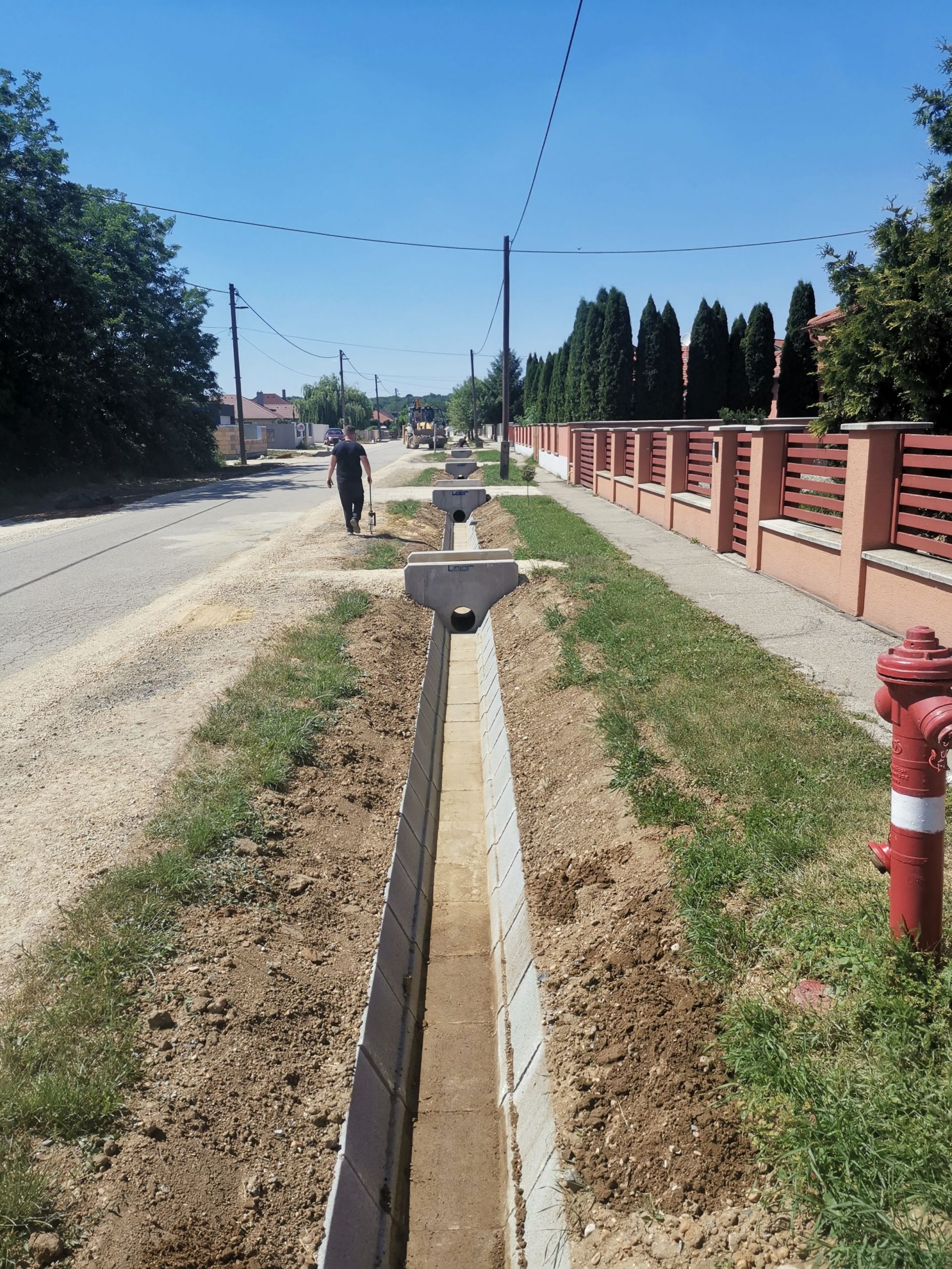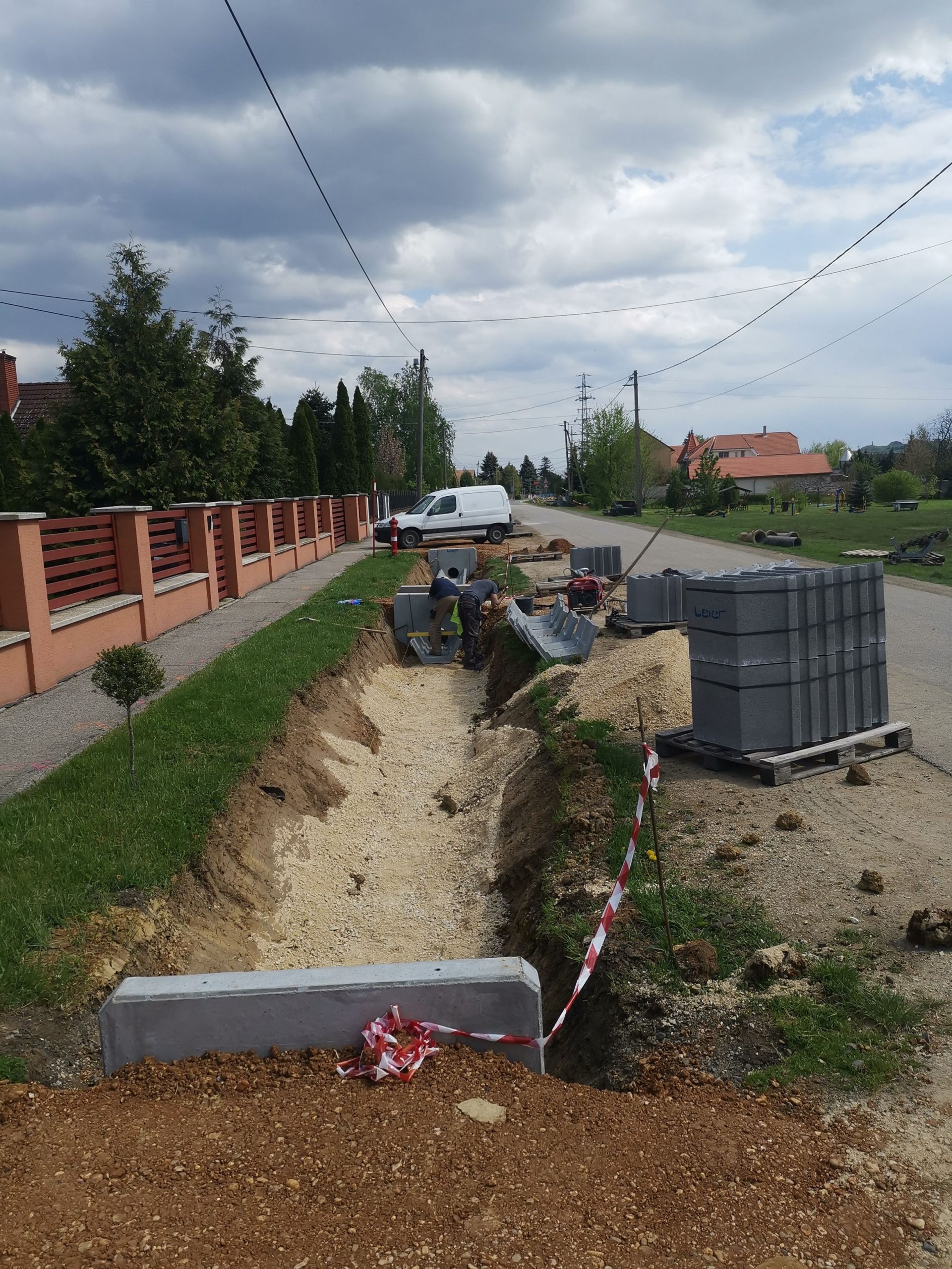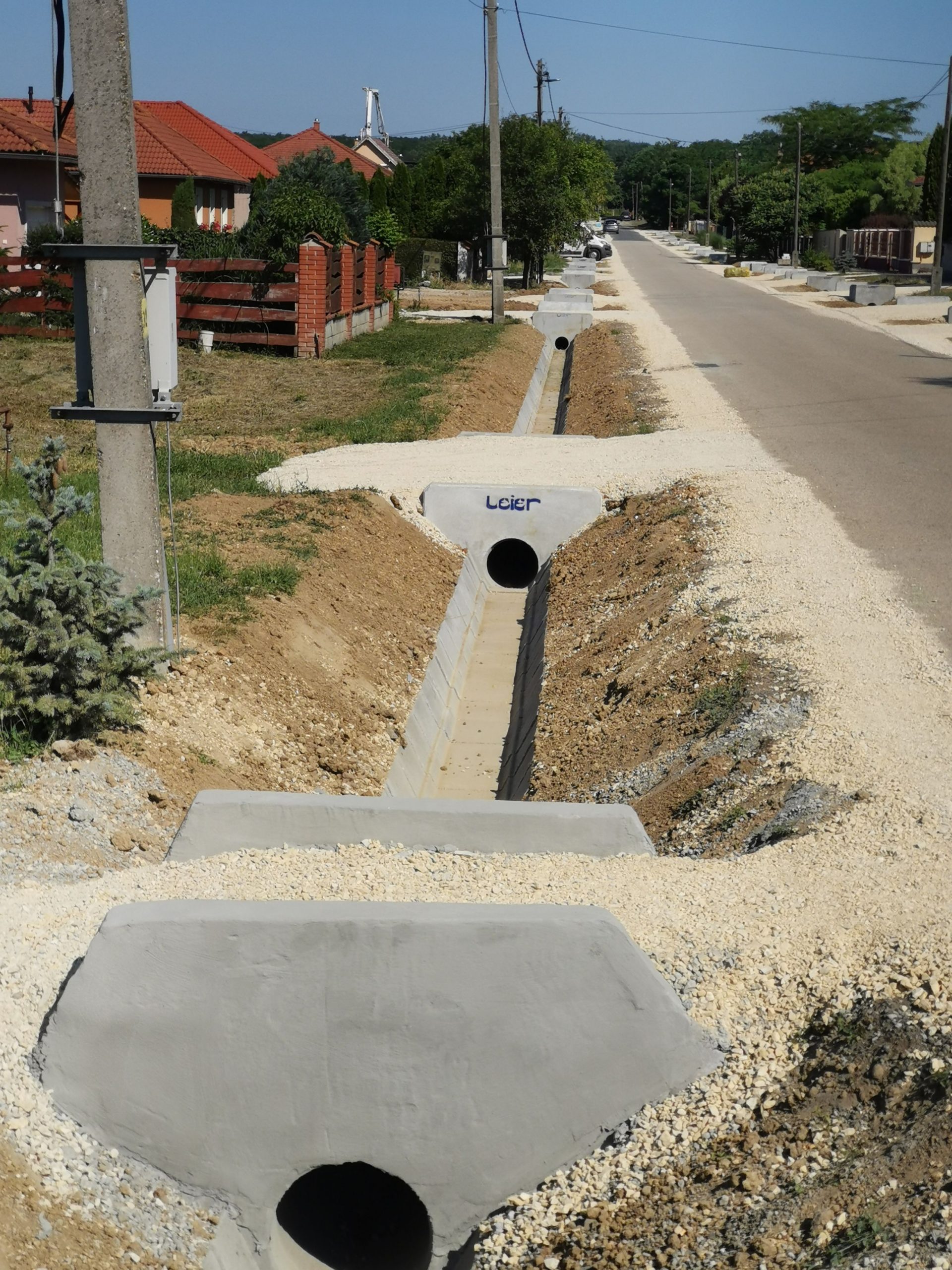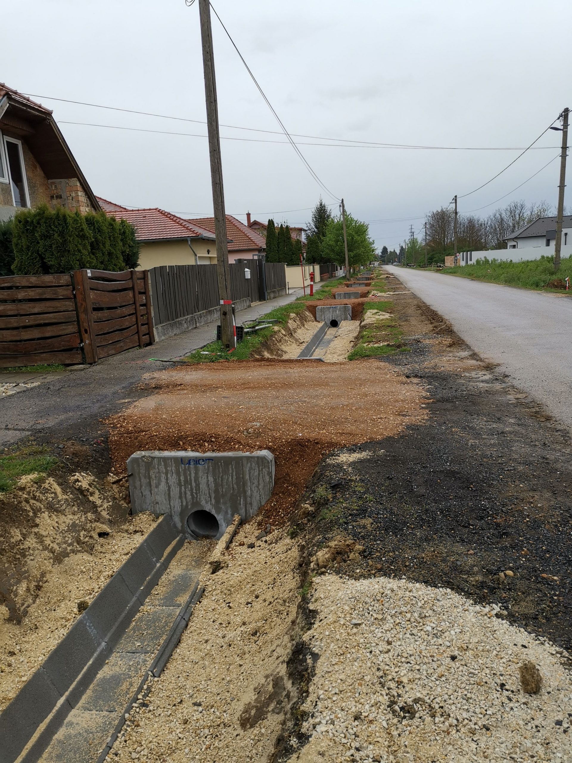 A kivitelezés 2021. május 18-án elérte az 50%-os készültséget. A munkálatok a meglévő közművek kutatóárkos feltárásával és így azok elhelyezkedésének pontosításával kezdődtek. A közműfeltárások előrehaladásával megkezdődtek a munkaárkok gépi földmunkái, melyet követően folyamatában kiépültek a kapubejárók alatti Ø30 betoncsöves csőátereszek az azokat lezáró előregyártott homlokfalak beépítésével. A kapubejárók közötti burkolt árok szakaszokon elkészültek az árokelemek alatti ágyazó rétegek és az alsó szakaszokon megindult az árokelemek beépítése.