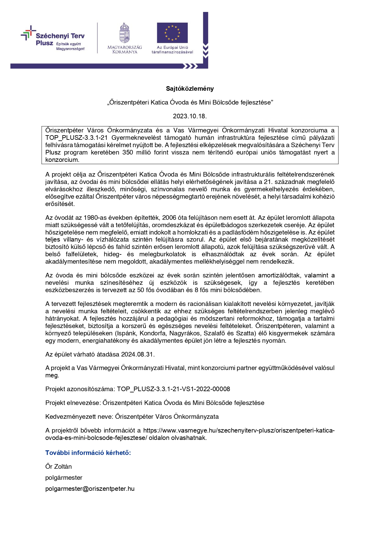 A projektmenedzsmenti, illetve a nyilvánossági és tájékoztatási feladatokat a projektben konzorciumi tagként részt vevő Vas Vármegyei Önkormányzati Hivatal látja el folyamatosan. A nyilvánossági feladatok biztosítása során elkészült a tervezett fejlesztést bemutató szórólap, melyet a város közintézményeiben helyeztek ki a település lakosainak tájékoztatása érdekében. 2023. október 18-án megtartották a projekt első sajtónyilvános rendezvényét is, melyen már részt vettek az óvoda felújítása, illetve a játszótér kialakítása vonatkozásában nyertes ajánlatot adó vállalkozások képviselői is.